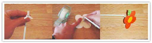 En el interior de estos tres cortes (el interior de la pajita) pegaremos las flores por su parte de atrás. Para pegarlas puedes usar el celo: será más cómodo y efectivo que hacerlo con pegamento. En el dibujo de abajo tienes el ejemplo de cómo se hace.